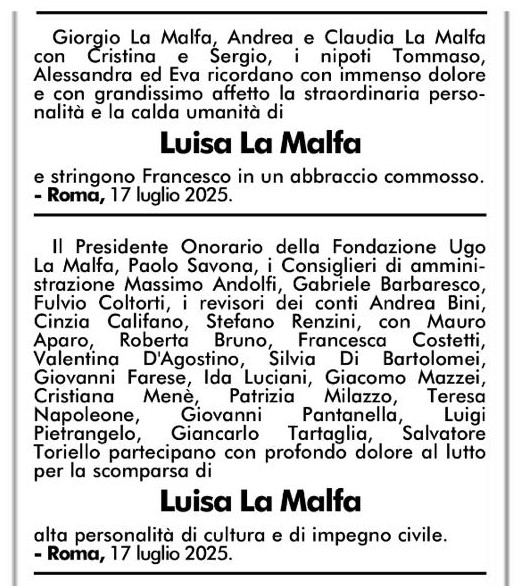 Nei giorni scorsi si è spenta Luisa La Malfa, consigliere e amica amatissima e stimatissima della Fondazione Ugo La Malfa.
