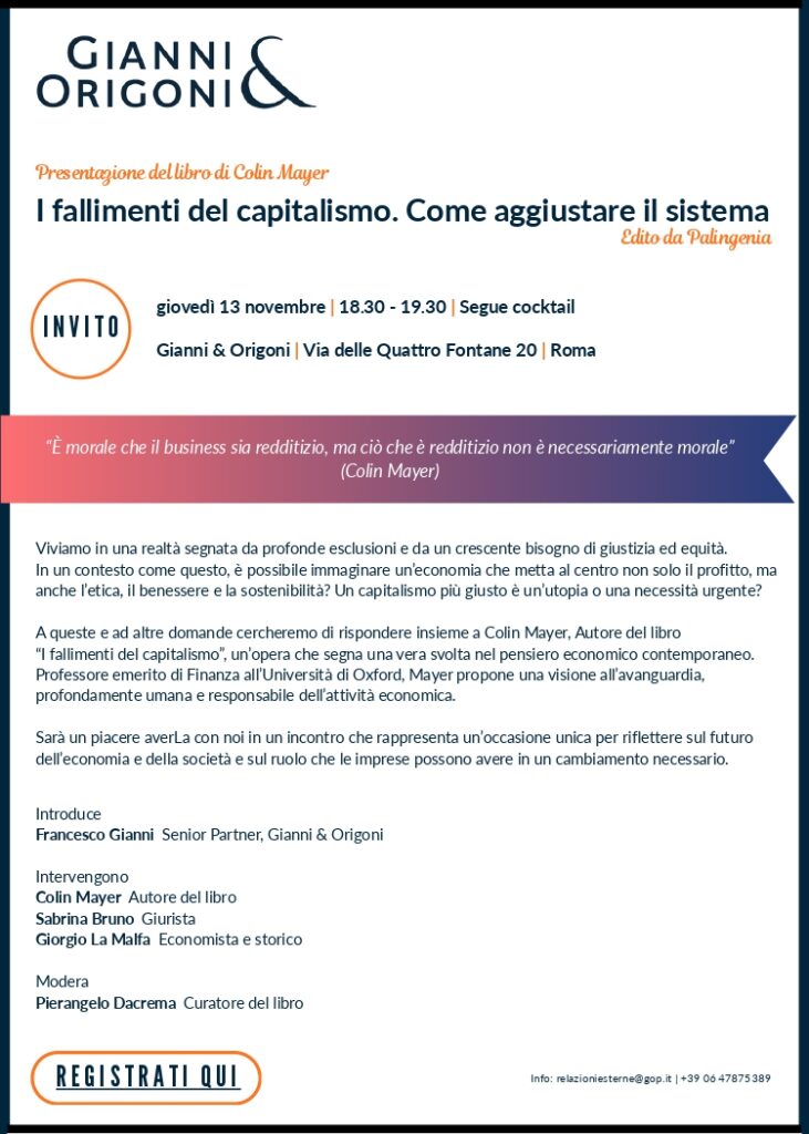 “I fallimenti del capitalismo. Come aggiustare il sistema”, di Colin Mayer. Interviene Giorgio La Malfa